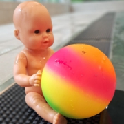 Das Arbeiten mit neuem, farbenfrohem Material wie schwimmfähigen Tennisringen, die das Spielen und Lernen im Wasser noch spannender machen sowie die bunten Farben und Formen laden zum Greifen, Staunen und Entdecken ein – und fördern ganz nebenbei die motorische Entwicklung der Kleinen.